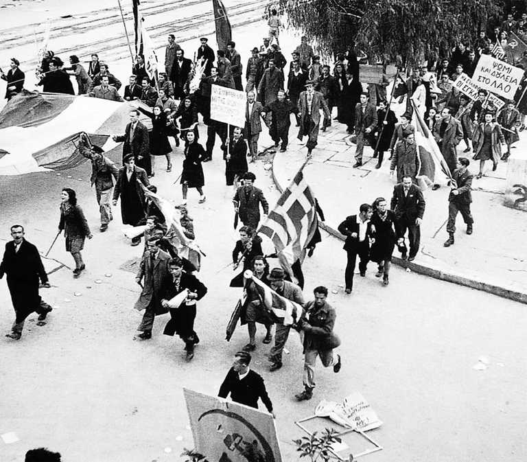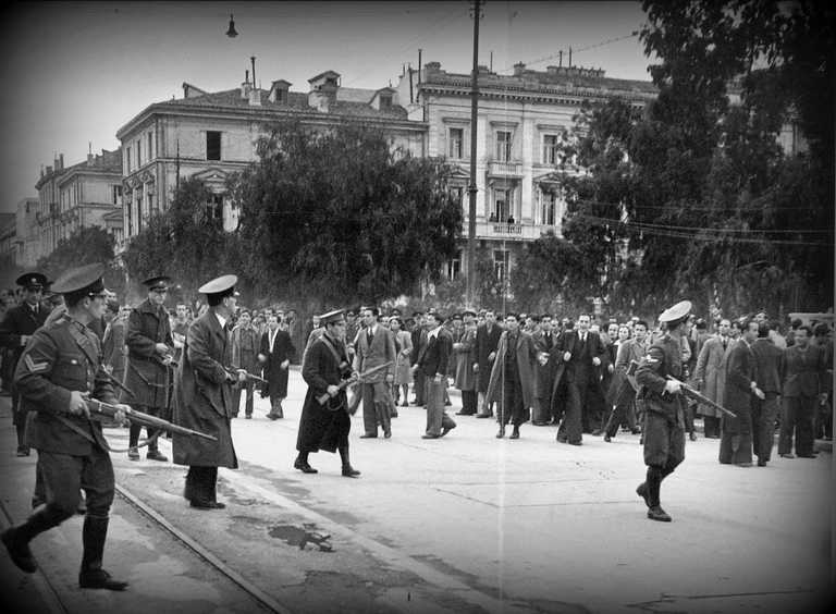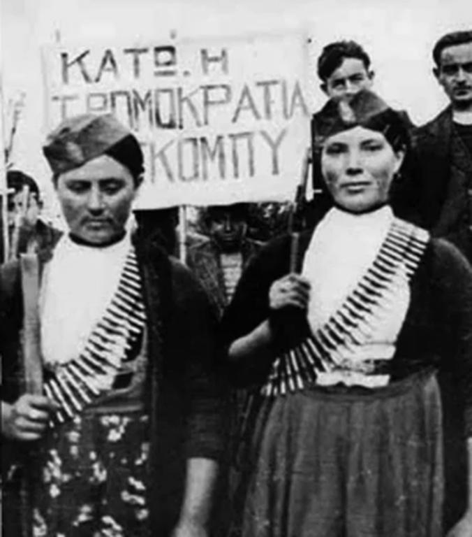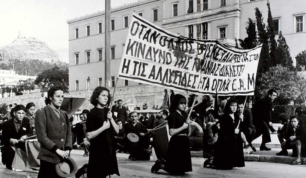 Το Δεκέμβρη του ’44, ο λαός της Αθήνας αντιμετώπισε σε άνισο αγώνα την ενωμένη δύναμη των εγγλέζικων στρατευμάτων και των ντόπιων στρατιωτικών και ένοπλων αστικών δυνάμεων, των ταγμάτων ασφαλείας, της ορεινής ταξιαρχίας, τους χίτες, την αστυνομία και άλλες ομάδες συνεργατών των Γερμανών που εξόπλισαν οι αστικές δυνάμεις και οι Εγγλέζοι. Και τότε ο λαός, ανάμεσα στις αλυσίδες και στα όπλα, διάλεξε τα όπλα. Γι’ αυτό όσα και αν γραφτούν εναντίον του Δεκέμβρη, θα μείνει ζωντανό το πύρινο σύνθημα του πανό που κρατούν οι μαυροφορεμένες κοπέλες της ιστορικής φωτογραφίας: «Όταν ο λαός βρίσκεται μπροστά στον κίνδυνο της τυραννίας, διαλέγει ή τις αλυσίδες ή τα όπλα».