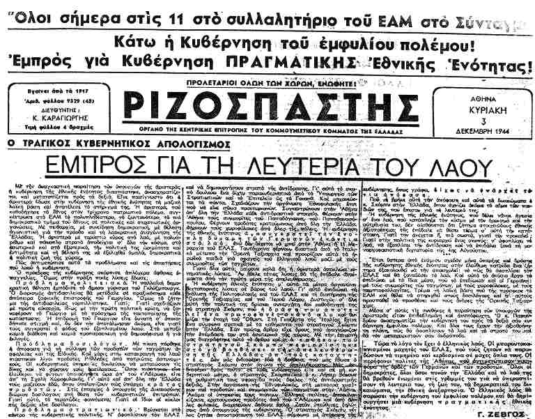 «Ξέρουμε ότι ετοιμάζετε με όλη τη φλόγα της μαύρης ψυχής σας αυτόν τον εμφύλιο πόλεμο», έγραφε ο «Ριζοσπάστης» της 30ής Νοέμβρη 1944 και σε αυτές τις γραμμές συμπυκνώνεται η ουσία όσων διαδραματίστηκαν στις 33 μέρες του ματωμένου Δεκέμβρη της Αθήνας το 1944, αλλά και μετά.