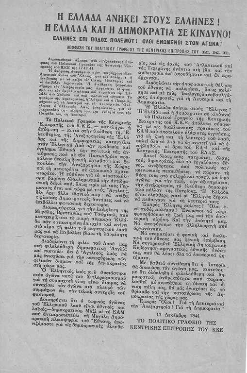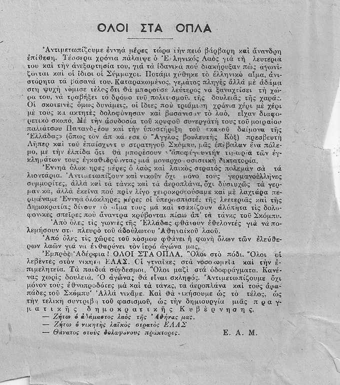Μαύρα σύννεφα σκίαζαν από την πρώτη στιγμή την απελευθέρωση του ελληνικού λαού από τους Γερμανούς φασίστες κατακτητές, απελευθέρωση που κέρδισε ο ίδιος με άφθαστο ηρωισμό και αμέτρητες θυσίες. Μπροστάρης του αγώνα αυτού, το ΕΑΜ και ο ΕΛΑΣ, που με ψυχή τους το ΚΚΕ κάλεσαν σε συναγερμό τις καλύτερες και αποφασιστικότερες δυνάμεις του λαού, που συσπειρώθηκαν σε ένα τεράστιο κοινωνικοαπελευθερωτικό λαϊκό μέτωπο.