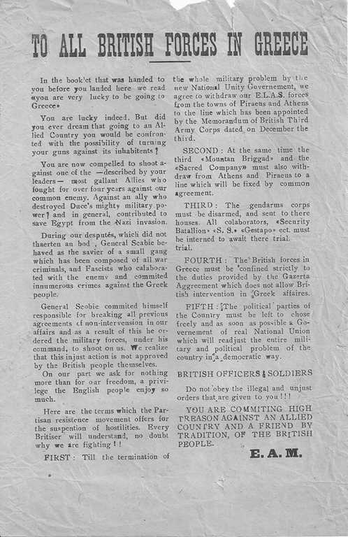 Την 1η του Δεκέμβρη ο αρχιστράτηγος των αγγλικών και ελληνικών ενόπλων δυνάμεων στην Ελλάδα Σκόμπι (Sir Ronald MacKenzie Scobie, 8/6/1893 – 23/2/1969) απείλησε το λαό με λιμοκτονία αν δεν υπάκουε. Στην προκήρυξή του έλεγε: «Στέκομαι σταθερά πίσω απ’ την τωρινή συνταγματική κυβέρνηση μέχρι να μπορέσει να εγκαθιδρυθεί το ελληνικό κράτος με μια νόμιμη ένοπλη δύναμη πίσω του και να μπορέσουν να γίνουν ελεύθερες εκλογές. Αν δεν το πετύχουμε όλοι μαζί αυτό, το συνάλλαγμα δε θα παραμείνει σταθερό και ο λαός δε θα φάει».