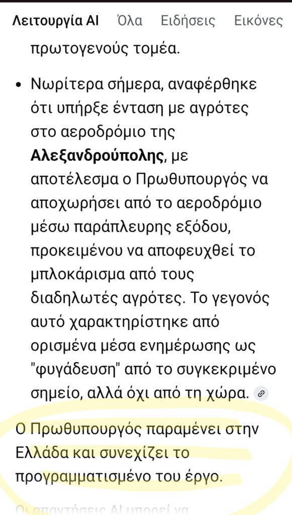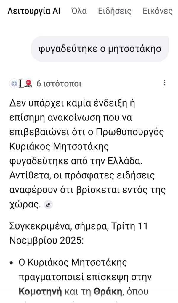 Γράφεις στο Google “φυγαδεύτηκε ο Μητσοτάκης”,να δεις ρε παιδί τι έγινε και σου βγαίνει η Ai να σου πει ότι όλα καλά εδώ είναι και συνεχίζει το προγραμματισμένο έργο του.